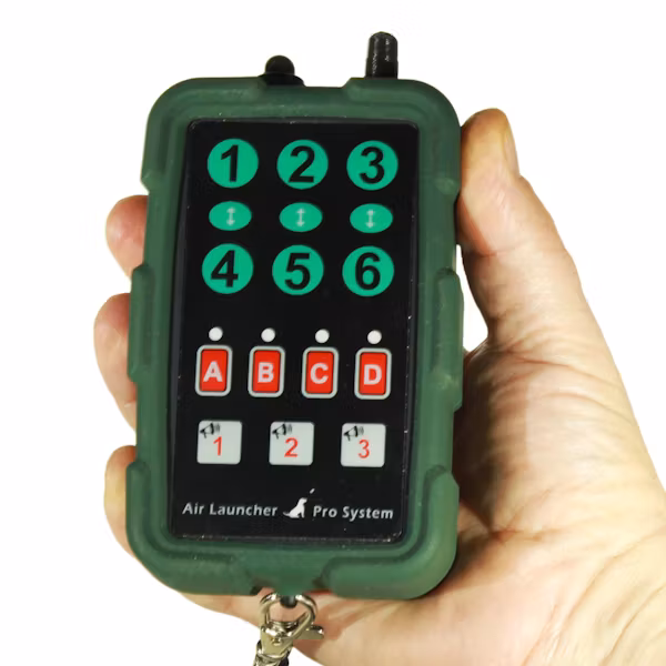 Hjärtat i Air Launcher Pro Systemet. Liten - enkel - lätt. Denna lilla sändare som är helt konstruerad och byggs av oss. Är utrustad med en microdator som möjliggör att kunna styra alla produkter i Air Launcher Pro Systemet, både nuvarande och framtida produkter, så det är den enda sändaren du behöver till alla produkterna.
