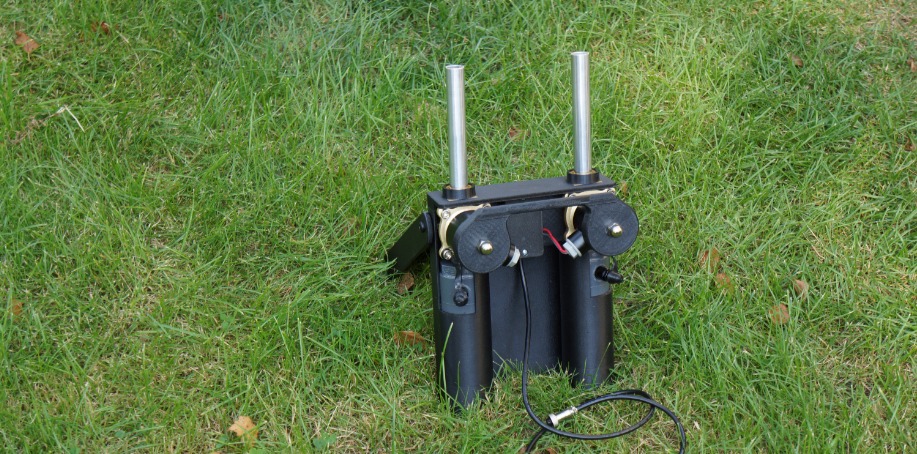 En liten smidig luftdriven apportkastare med inbyggd kompressor och 3 skjutrör. Väger bara 7kg så den är lätt att bära med sig. Man kan ha 2st V3 Kastare på en kanal, så man får tillgång till 6 skjutrör, och den stora fördelen är att man kan ställa dessa var man vill helt åtskilda ifrån varandra men fungerar på en kanal, och eftersom man har 4 kanaler på sändaren så klarar systemet 8st V3 kastare samtidigt. Självklart finns det även ett uttag för en ljudenhet på den. Batteriet finns för både Makita och Bosh, lagom storlek på batteriet är runt 5Ah, som då räcker till ca:50st avfyrningar.